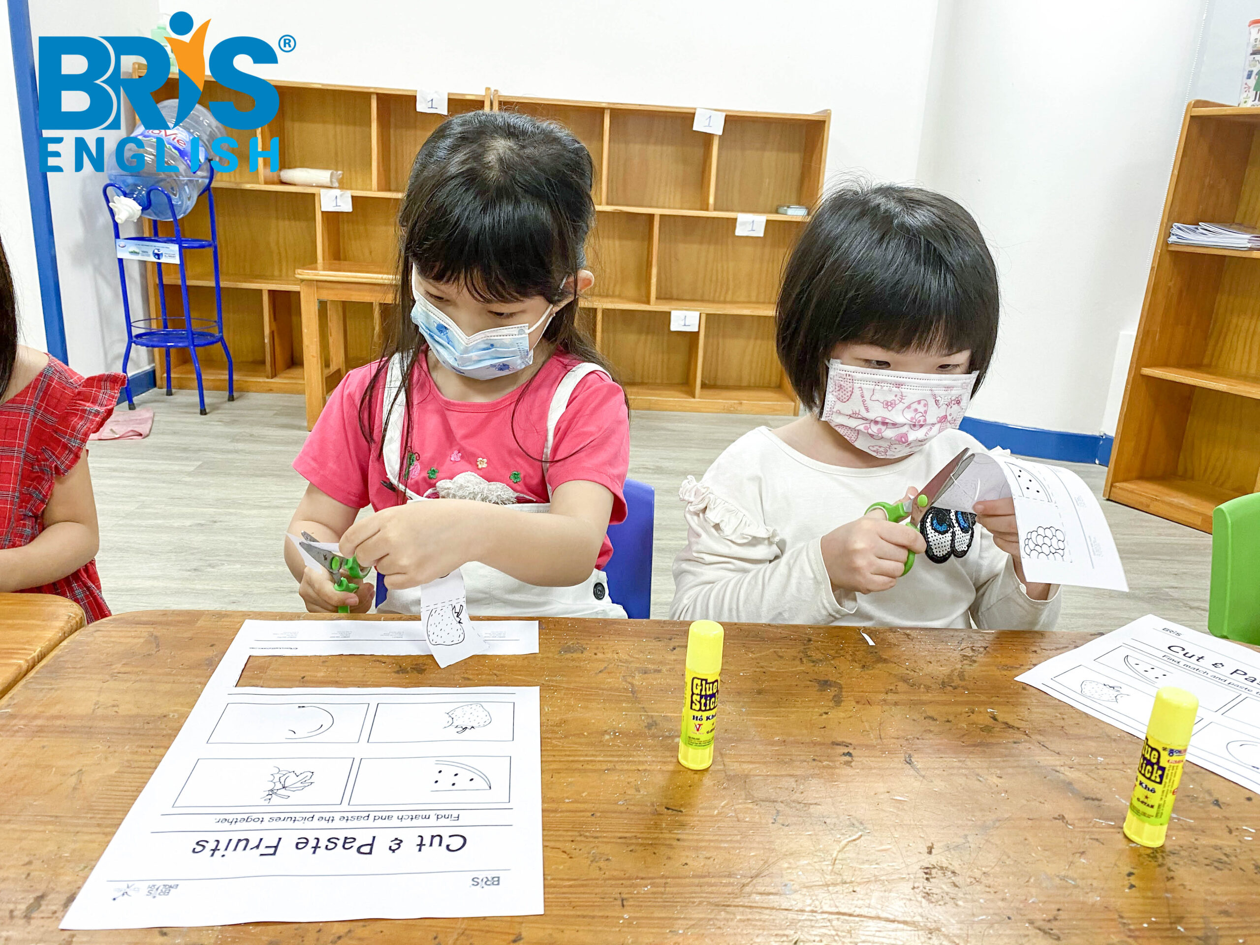 Các con được thực hành cắt và dán các hình trái cây vào đúng tên Tiếng Anh của từng loại