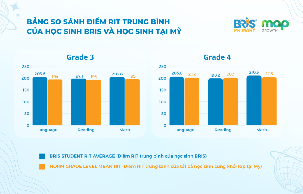Đặc biệt, kết quả thống kê cho thấy học sinh Khối 3 và Khối 4 tại BRIS đạt điểm RIT trung bình trong 3 môn (Language Usage, Reading, Math) tương đương bằng điểm RIT trung bình của tất cả học sinh cùng khối lớp tại Mỹ.