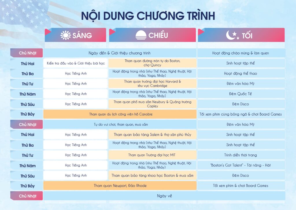 Nội dung chương trình khóa học hè BRIS tại CATs Academy Boston phù hợp cho các bé từ 8 đến 14 tuổi, bao gồm học thuật tiếng Anh với giáo viên bản ngữ, tham quan các địa điểm nổi tiếng như công viên hồ Canobie, bảo tàng Salem và thợ săn phù thủy, trường Đại học MIT, bảo tàng khoa học Boston, Newport, Đảo Rhode, phố mua sắm Newbury và Quảng trường Copley. Ngoài ra còn có các hoạt động ngoại khóa chào mừng và làm quen, sinh hoạt chung và các đêm văn nghệ diễn ra mỗi đêm tại trường.